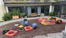 Der Elementarbereich (2.-6. Lj.) befindet sich auf zwei Stockwerken eines renovierten villenähnlichen Gebäudes. Verbunden durch einen freundlichen und hellen Glaskorridor gelangt man in den angegliederten Neubau. Hier befinden sich unsere beiden Kleinkindgruppen, unser Empfangsbereich, unser einladendes Bistro, der Turnraum sowie unsere Küche. Unsere zwei Hofbereiche laden Kinder zum selbstgestalteten Spielen ein.